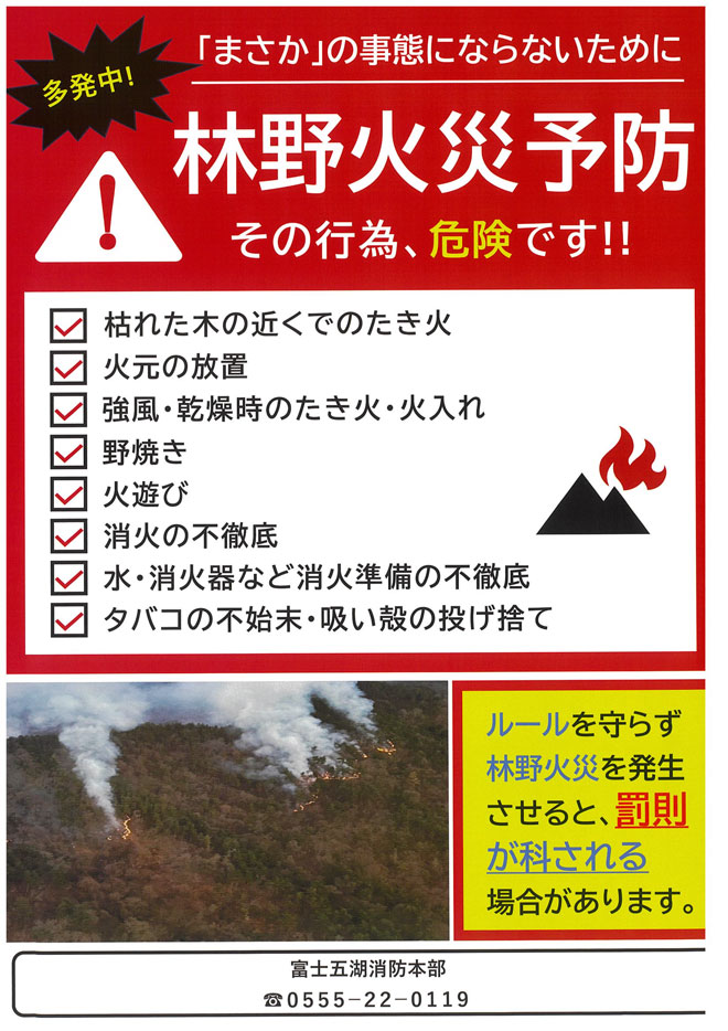 富士河口湖町周辺(山梨県)は、特に2月から5月にかけての乾燥・強風期に林野火災が発生・拡大しやすいため、 注意報発令時は焚き火やタバコのポイ捨てを厳禁とし、火の取扱いに厳重な警戒が必要です。山火事は急速に延焼し、消火が困難になるため、行政の情報を確認してください。 消防署より、1月1日より本日30日まで注意報は1度も解除されていません。